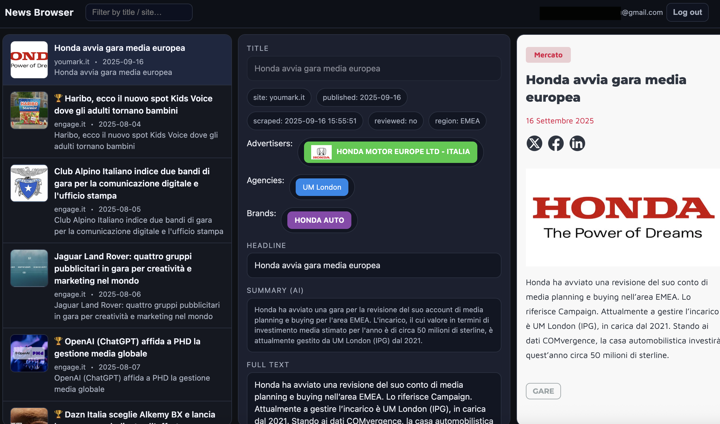 - Parsing AI (Gemini Flash 2.5) : classification, duplicate detection, brand extraction, advertisers, agencies.